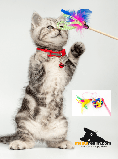 - Feather wand toys – Attach a feather to a string and stick for an interactive play session.